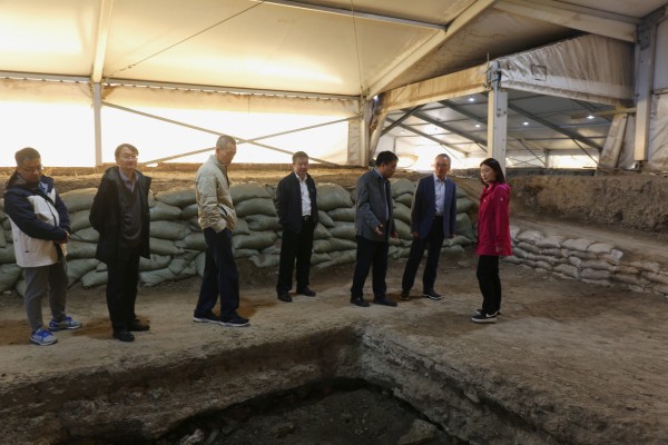 调研组一行先后来到大宫门考古现场、西洋楼公众考古现场实地考察考古工作,反复查看地形地貌,共同探讨遗址的保护措施。在拾光买卖街,调研组观看了数字化复原的圆明园海晏堂及3D裸眼影片《千机圆明》,借助光影科技,沉浸式体验空间让大家仿佛穿越时空,重返盛世圆明园。